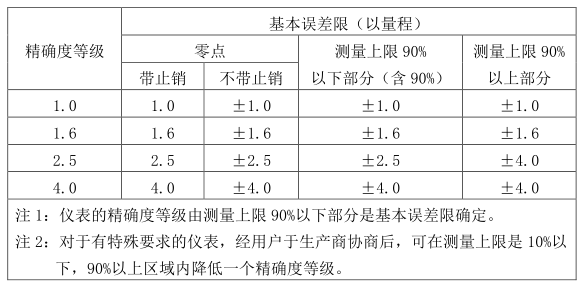 根據(jù)******標準《一般壓力表》(GB/T 1226-2010),普通壓力表的精度分為1.0級、1.6級、2.5級和4.0級;根據(jù)******標準《精密壓力表》(GB/T 1227-2010,精密壓力表的精度分為0.1級、0.16級、0.25級和0.4級。