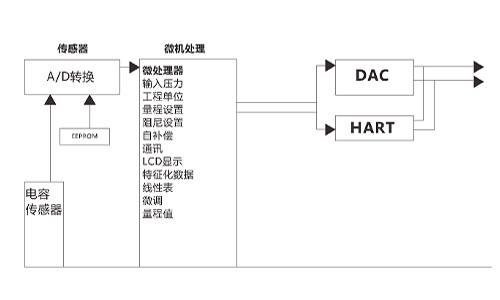 測(cè)量壓力由電容式敏感元件轉(zhuǎn)換為電容變量,經(jīng)C/D電路直接轉(zhuǎn)換為數(shù)字信號(hào)轉(zhuǎn)換后送往微處理器,通過運(yùn)算修正的數(shù)字信號(hào)再經(jīng)D/A轉(zhuǎn)換成4~20mADC輸出信號(hào)送往顯示/調(diào)節(jié)儀表或DCS等裝置。通信線路將來自微處理器的測(cè)量壓力數(shù)字信號(hào)轉(zhuǎn)換成頻率信號(hào)并疊加于4~20mADC模擬信號(hào)上,由相應(yīng)的HART終端設(shè)備接收。